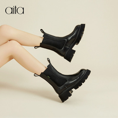 AITA艾塔真皮烟筒靴2021秋季新品字母厚底马丁靴一脚蹬时尚松糕鞋