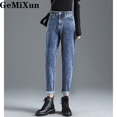 GeMiXun 高腰宽松弹力牛仔裤女秋冬新款弹力显瘦萝卜老爹哈伦裤子